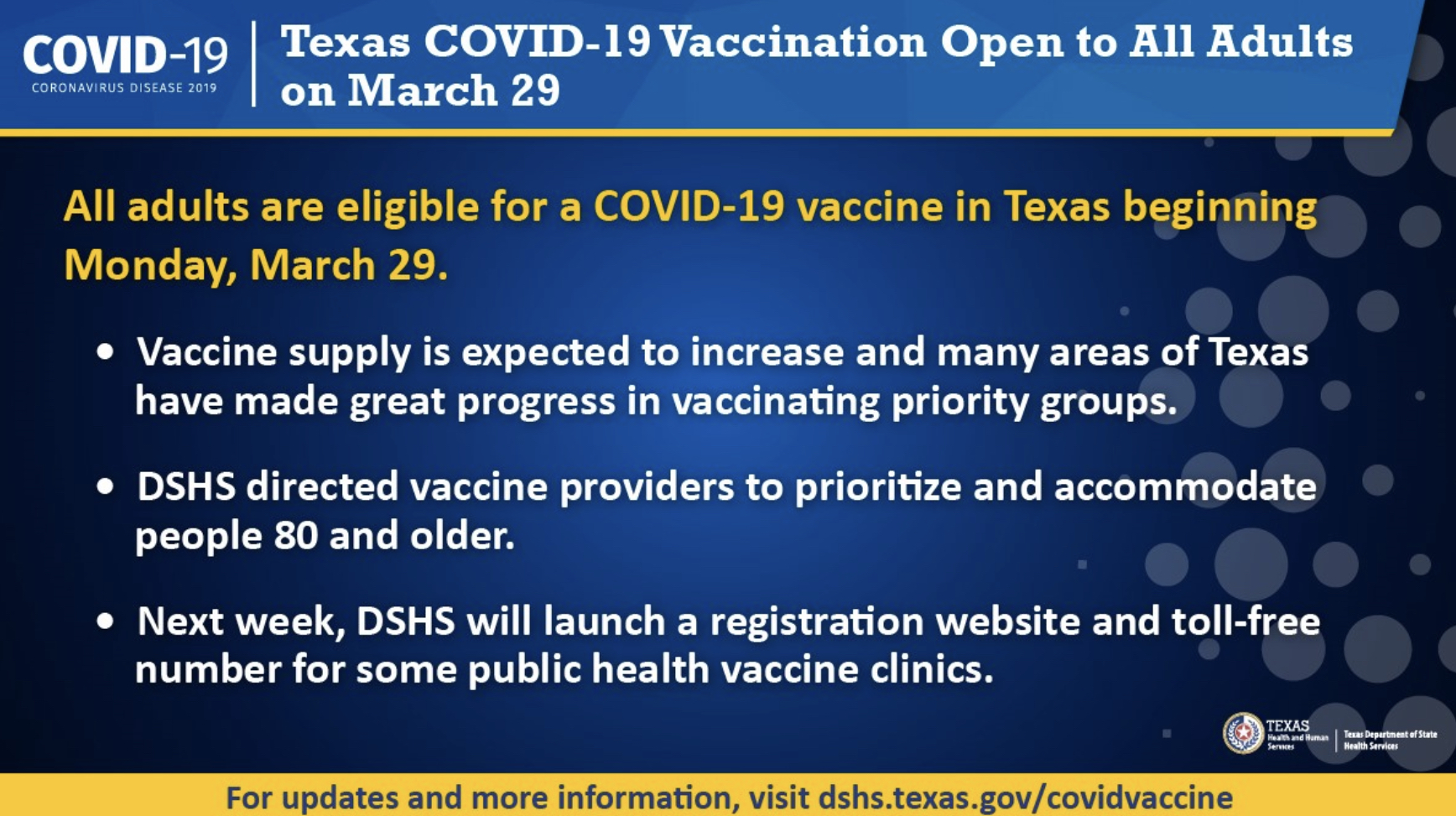 텍사스 보건국은 모든 성인으로 백신 접종을 확대함에 따라 백신 예약 사이트에 대한 업데이트와 새로운 예약 웹사이트를 다음주 안으로 개설할 예정이다.