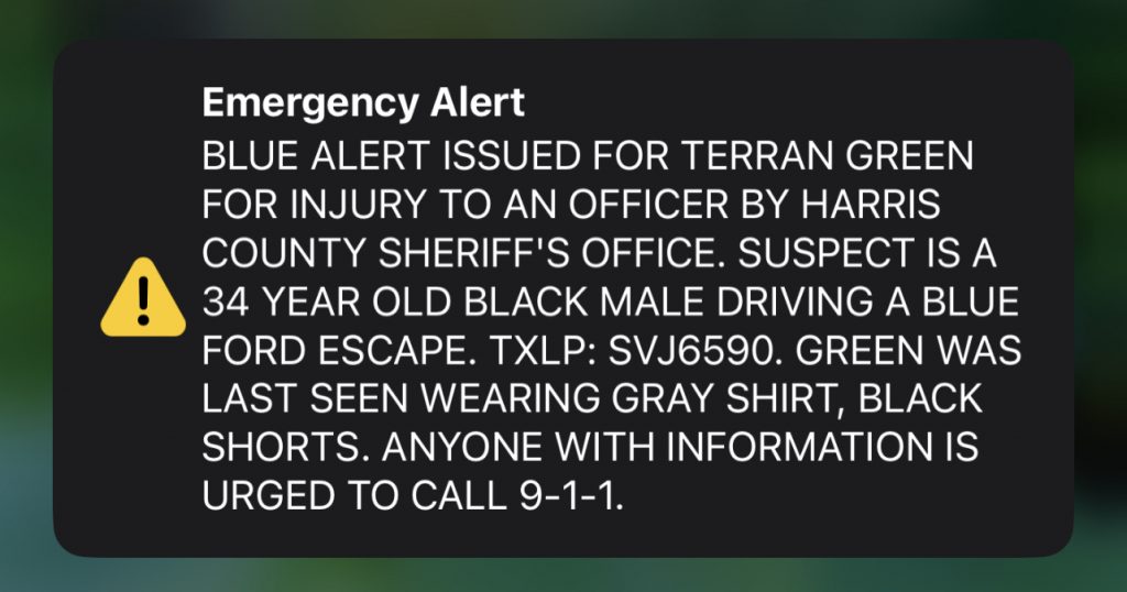 16일(수) 밤 텍사스 주민 휴대폰에는 블루경보가 떴다. 블루경보란 경찰과 보안관 등 법 집행관을 살해하거나 중상을 입힌 용의자를 추적하는 경보다.