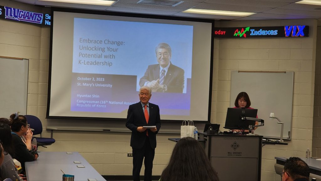 샌안토니오 세종학당에 따르면 지난 2일(월) 샌안토니오에 위치한 세인트 메리 대학에서 신현태 전 의원은 ‘한국적 리더십으로 변화를 두려워하지 말고 억눌려진 자신의 잠재력을 해방시켜라’라는 주제로 강연했다.