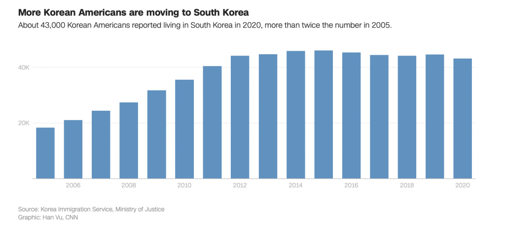 CNN은 한국 법무부의 자료를 바탕으로 2020년을 기준으로 4만 3,000여명의 한국계 미국인이 한국에 거주하고 있으며 이는 2005년보다 두배 이상 많은 수치라고 보도했다.