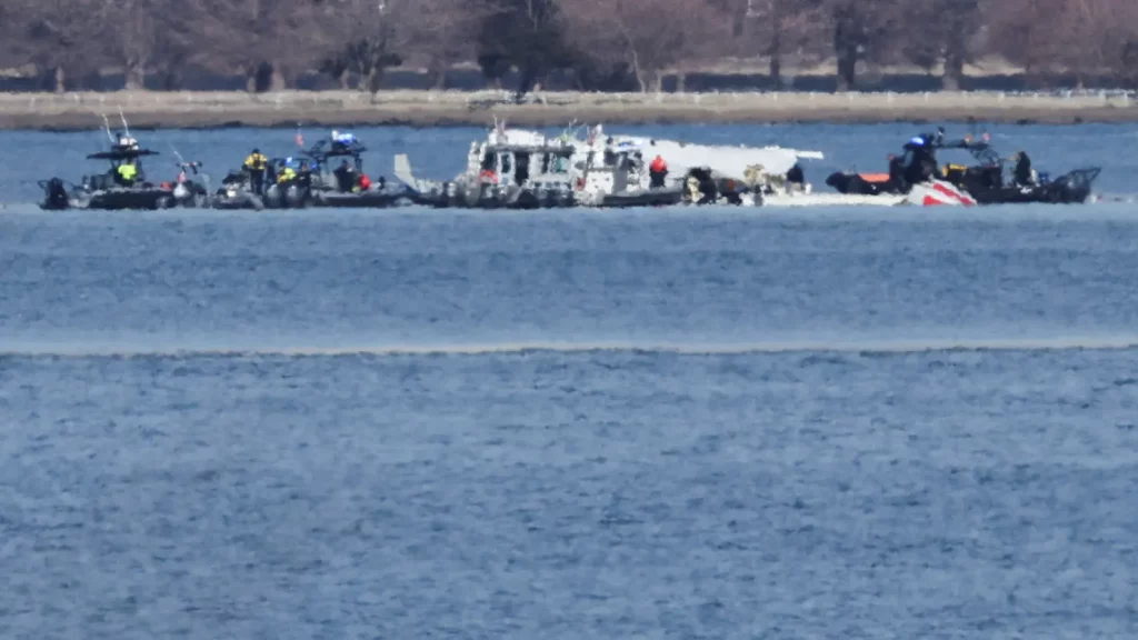 사진/ CNBC (Emergency workers recover debris from the Potomac River in the aftermath of the collision of American Eagle flight 5342 and a Black Hawk helicopter, as seen from Virginia, U.S., January 30, 2025. Carlos Barria | Reuters)