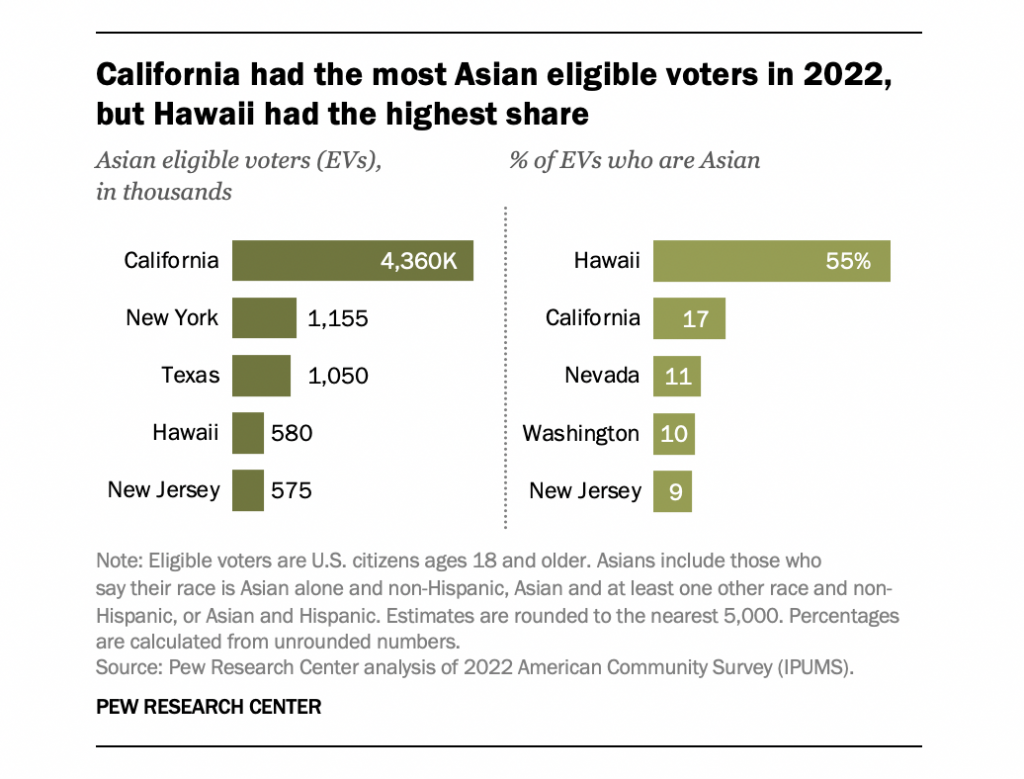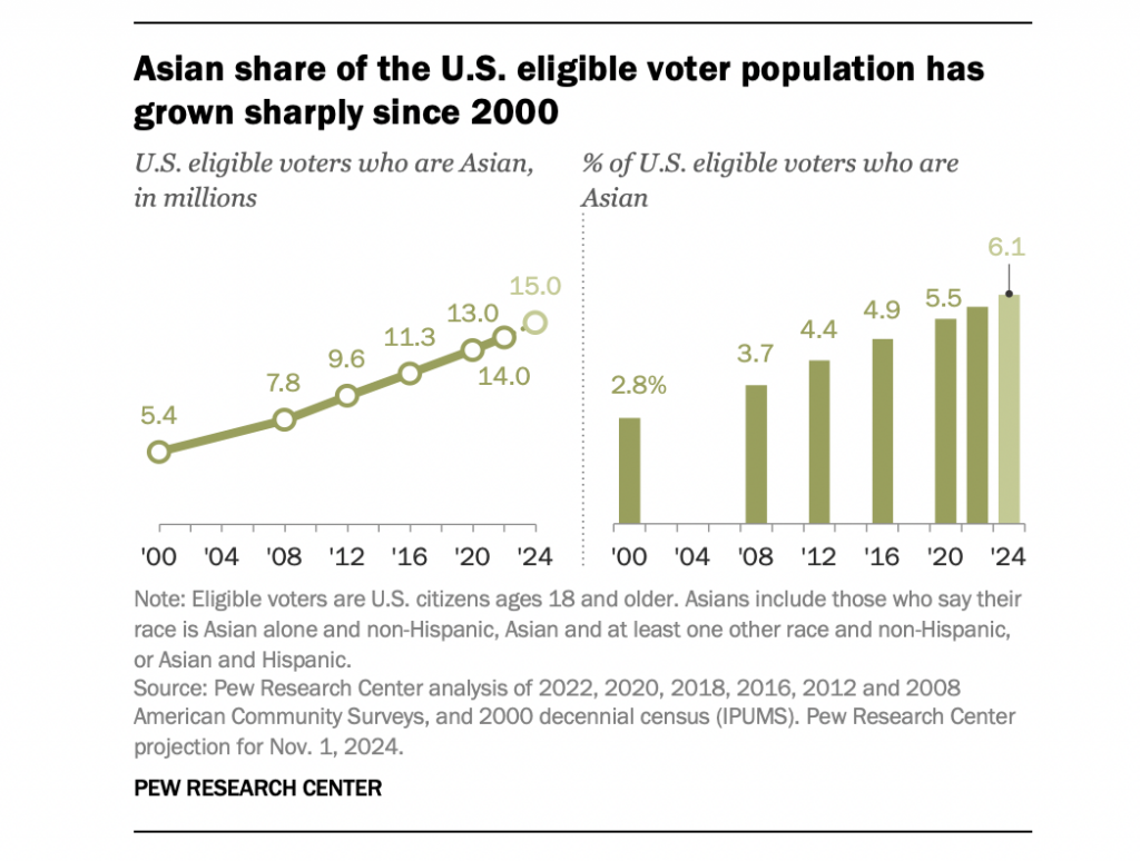 2024년 대통령 선거를 앞두고 퓨 리서치 센터는 약 1,500만 여명의 아시아계 미국인이 투표자격을 갖출 것으로 예상하며 이는 미국 전체 투표자격 유권자의 6.1%에 불과하지만 10년전과 비교했을때 상당히 늘어난 수치라는 것이 퓨리서치의 연구결과다.