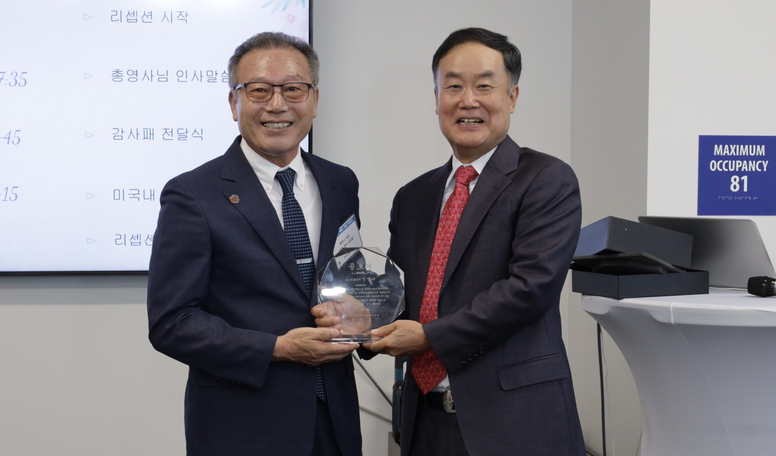사진/ 황병구 총회장(왼쪽)이 안명수 총영사(오른쪽)에게 감사패를 전달하고 있다.