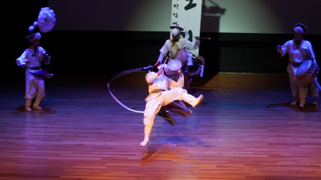 소리도, 음의 높낮이도 다른 한국 전통 민속악기인 꽹과리와 장구, 북, 징으로 만들어내는 가락은 강력했다. 소고를 들고, 상모를 돌리며 자반뒤집기를 하는 순간 관객들은 숨이 멋는다. 상쇠가 머리에 쓴 부포가 흩날리 때는 마치 한폭의 꽃이 피었다 지는 것과 같다. 역동적 움직임에 섬세한 아름다움까지 섞인 디테일에 관객들은 연신 감탄한다. 손으로는 악기를 연주하고 발에는 리듬이 담기고 머리위에서는 상모가 돌아간다. 무대위 도리의 모든 가락과 움직임에는 서사가 담겨있고 이에 관객들은 눈을 떼지 못한다.