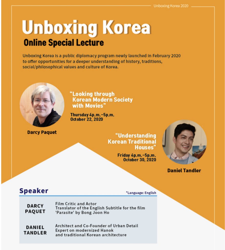 이번 ‘언박싱 코리아’ 에서는 온라인 스페셜 강의가 준비되는데 봉준호 감독의 영화 기생충의 영어 자막 작업을 한 달시 파켓(Darcy Paquet)과 대니얼 텐들러(Daniel Tandler)가 연사로 나선다.