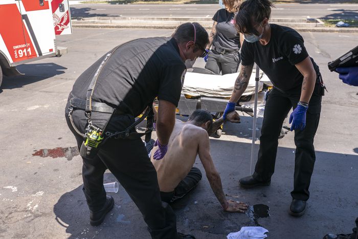 사진 / Salem Fire Department Capt. Matt Brozovich, left, and Falck Northwest ambulance personnel help treat a man experiencing heat exposure at a cooling center during a heat wave, Saturday, June 26, 2021, in Salem, Ore. (AP Photo/Nathan Howard)