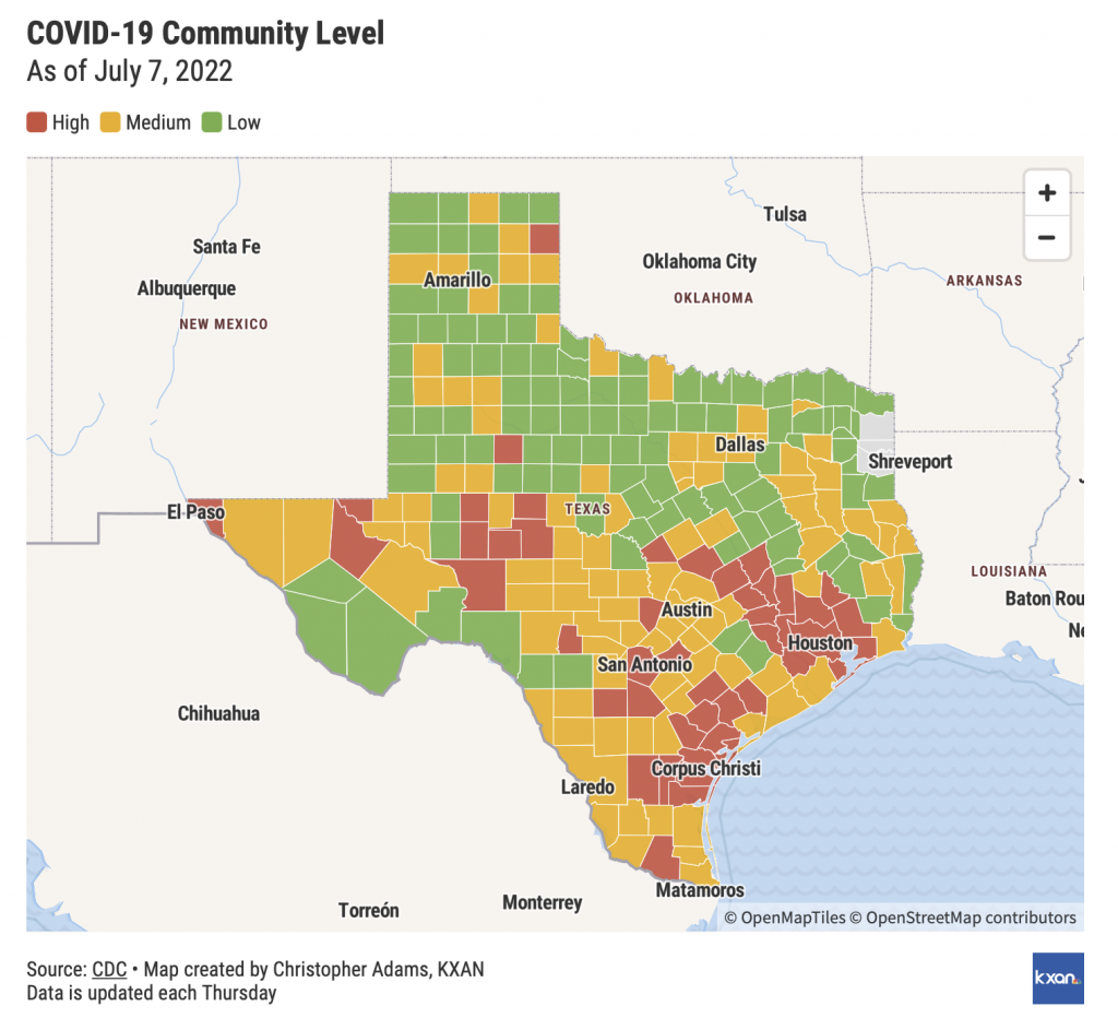 중부 텍사스에서는 블랑코, 람파사스, 밀리암 카운티가 고위험군으로 올랐고 오스틴 트레비스카운티와 윌리엄스 카운티, 배스트랩 카운티 등은 낮은 위험군에서 중간정도 위험군으로 상향조정됐다.  북텍사스 지역은 남부지역에 비해 위험도가 낮은 편이나 달라스 인근 지역도 낮은 위험군에서 중간등급으로 상향됐다.