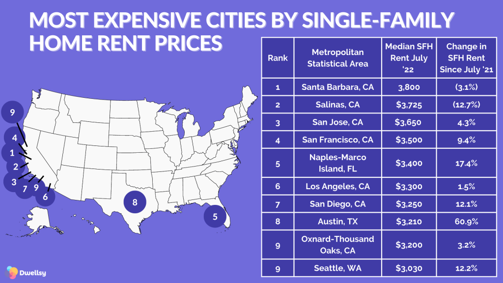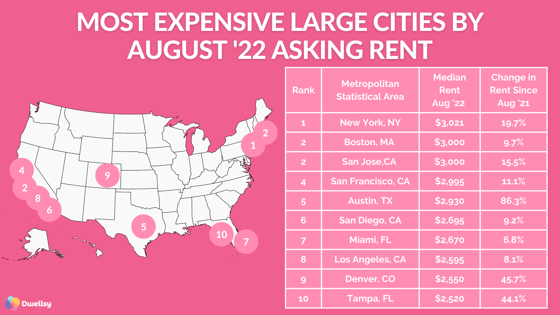 임대료가 가장 비싼 도시로는 1위가 뉴욕(중간값 3,021달러), 2위는 보스턴(중간값 3,000달러)이다. 이어 산호세(중간값 3,000달러), 샌프란시스코(2,995달러)가 뒤를 이었고 오스틴이 그 다음으로 높은 임대료를 보인 것으로 조사됐다.