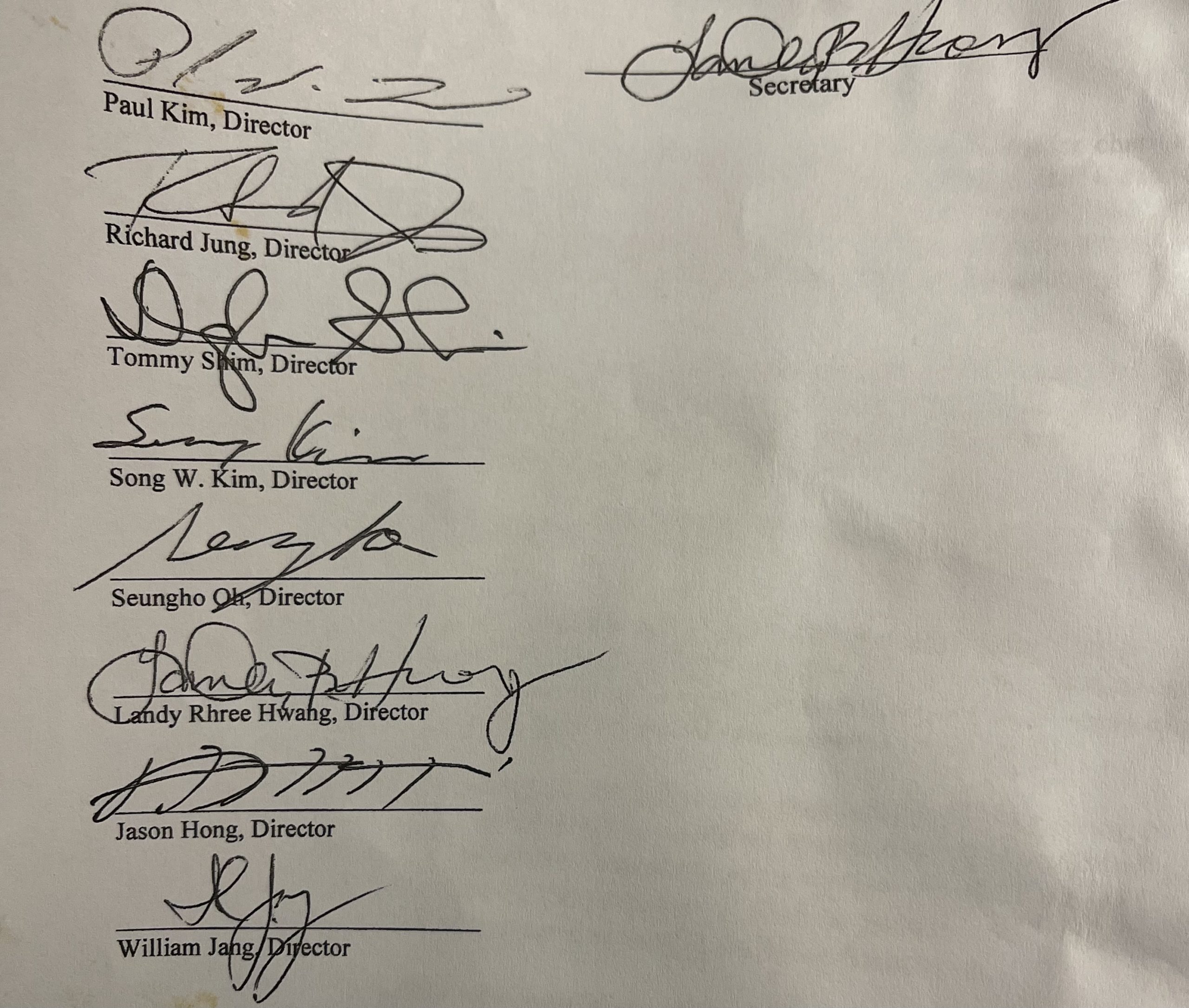 영문 회칙 마지막 장(아래 참조1)에는 날짜와 회칙 감수에 참여한 이들의 서명이 반드시 들어가 있어야 공신력을 인정받는다. 하지만 선관위가 후보자에게 공개한 회칙에는 서명이 없다. 결국 선관위가 쉬쉬하며 기자들에게도 공개를 꺼렸던 번역본 한인회칙은 신뢰성 부족에 불법 수정의혹까지 겹치는 상황이 됐다.