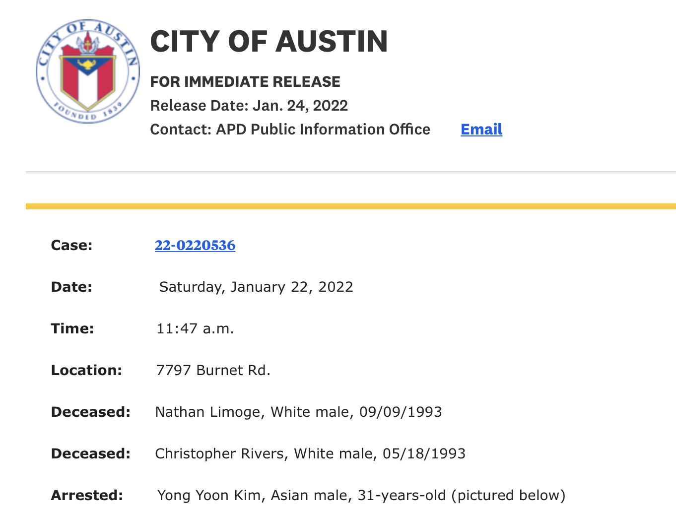 오스틴에서 30대 한인남성이 총격살인 혐의로 체포됐다. 오스틴 경찰국에 따르면 지난 22일(토) 오전 11시 47분 경 31세 한인 김용윤(Yong Yoon Kim)는 앤더슨 레인에 위치한 세이트 루이스 축구장 뒷편 주차장(7797 Burnet Rd)에서 두명의 남성을 향해 총격을 가했다.