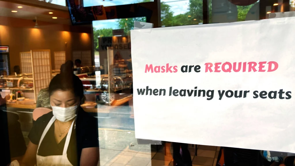 사진/ Kxan(In this June 17, 2021, file photo, a sign requiring masks is displayed at a restaurant in Rolling Meadows, Ill. (AP Photo/Nam Y. Huh, File))