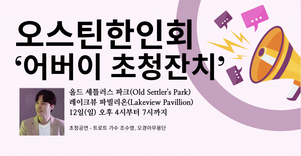 5월 가정의 달을 맞아 오스틴 한인회(회장 이옥희)가 ‘어버이 초청 잔치’를 마련한다. 오스틴 한인회에 따르면 오는 12일(일) 라운드락에 위치한 올드 세틀러스 파크(Old Settler’s Park) 레이크뷰 파빌리온(Lakeview Pavillion)에서 오후 4시부터 7시까지 3시간 동안 진행된다.
