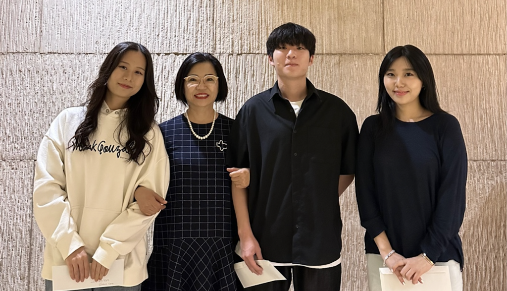 사진/ 오스틴 한인회 이옥희 회장(사진 왼쪽에서 두번째)이 선발된 4명의 장학생중 수업으로 인해 참석이 불가능한 학생을 제외한 3명의 장학생들과 기념사진을 찍고 있다.