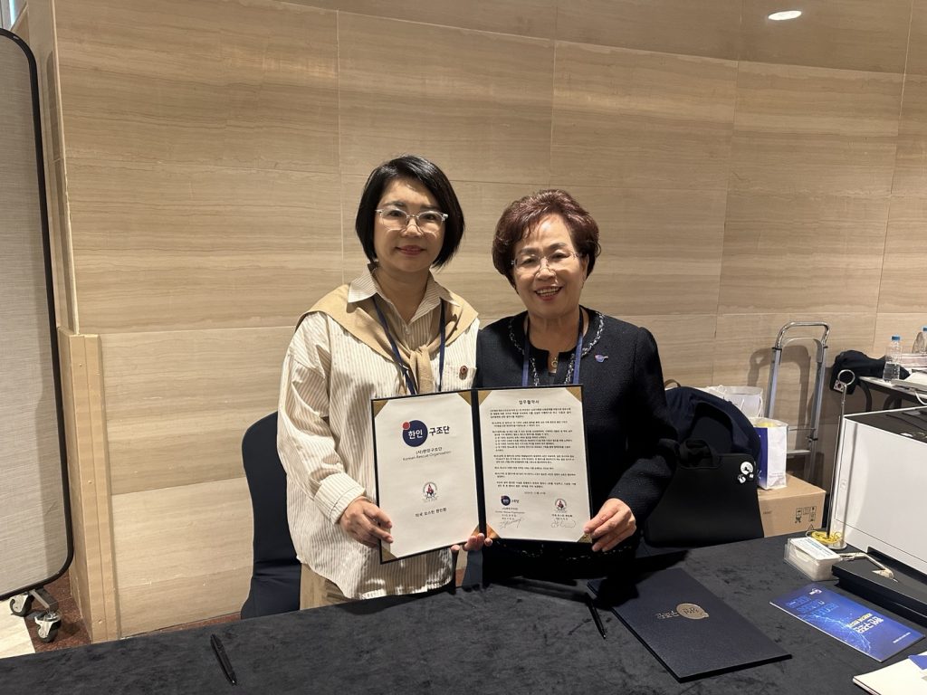 사진/ 오스틴한인회 제공( 오스틴 한인회 이옥희 회장과 재외한인구조단 이정숙 회장이 지난달 한국 롯데호텔에서 상호 업무협약을 맺고 기념사진을 찍고 있다.)