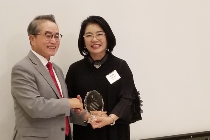 사진/ 오스틴한인회 이옥희 회장(사진 오른쪽)이 정영호 총영사(왼쪽)로부터 최우수 한인회상을 수여받았다.