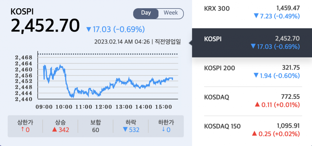 외국인 순매수가 증가하면서 코스피가 3일 연속 하락했다. 이에 따라 한국은 미국의 이번주 발표될 연방준비제도(Fed·연준)의 인프레이셔 데이터를 토대로 긴축정책 조기 종료에 타격을 줄 것이라는 우려에 3일 연속 하락했다고 로이터는 보도했다.