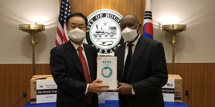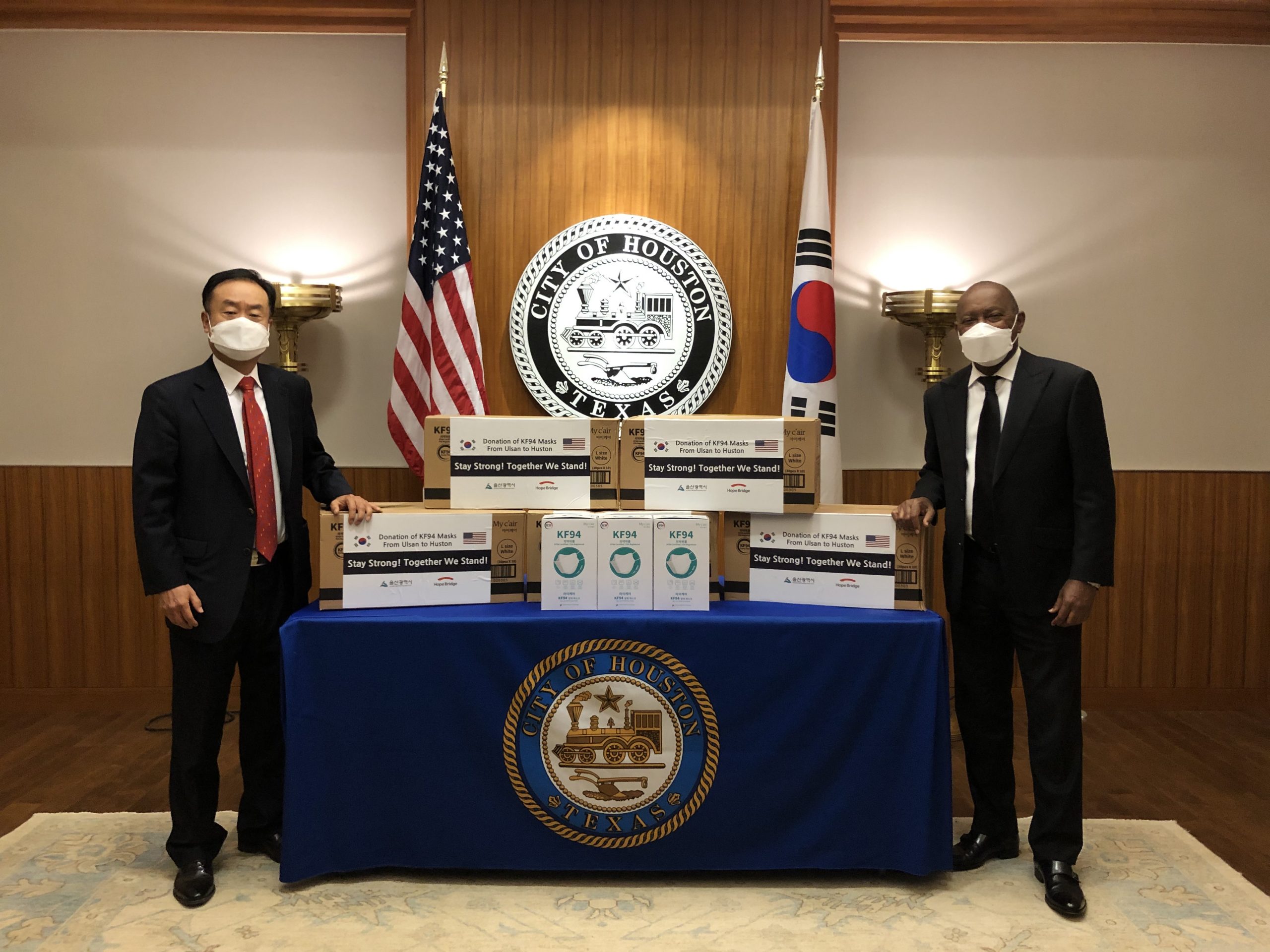 울산광역시(시장 송철호)가 주휴스턴총영사관(총영사 안명수)를 통해 휴스턴에 마스크 4만 8,000장을 기증했다. 총영사관은 지난 30일(월) 울산시로부터 받은 ‘KF94’마스크를 실베스터 터너(Sylvester Turner) 시장에게 전달했다.