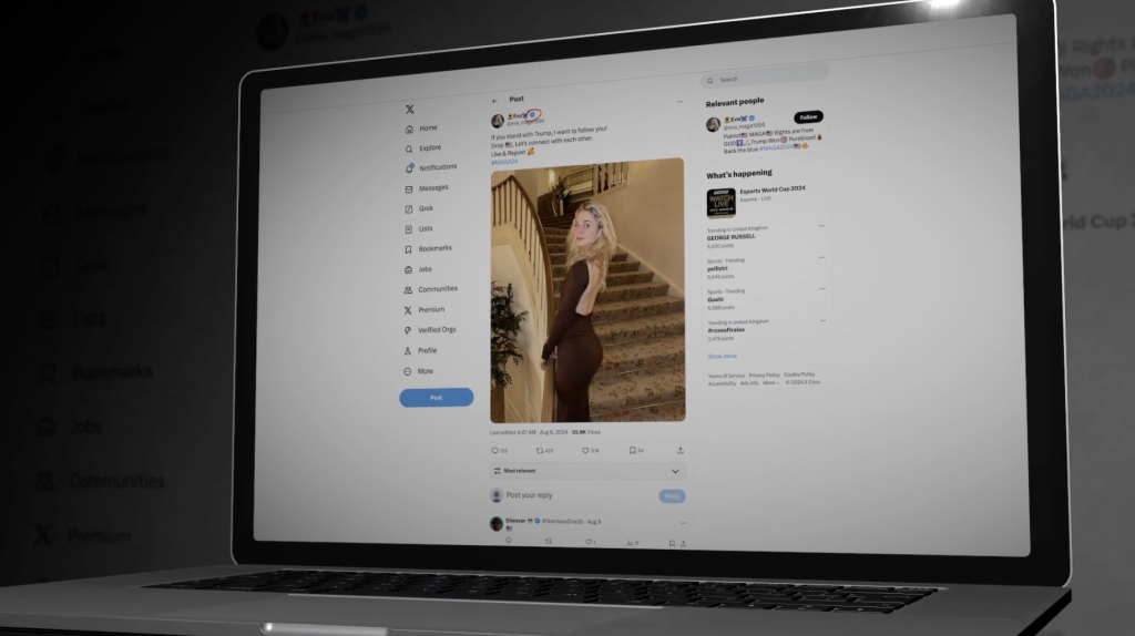 도널드 트럼프 전 대통령을 지지한다는 가짜 X(구 트위터) 계정에 유럽 여성들의 사진이 도용된 것으로 밝혀졌다. 현재까지 밝혀진 것만해도 56개에 달하며 이들은 모두 트럼프에 대한 지지를 선언하고 #MAGAPatriots, #MAGA2024 및 #IFBAP(I Follow Back All Patriots)와 같은 해시태그를 사용하는 아름답고 젊은 여성의 사진을 사용한다.