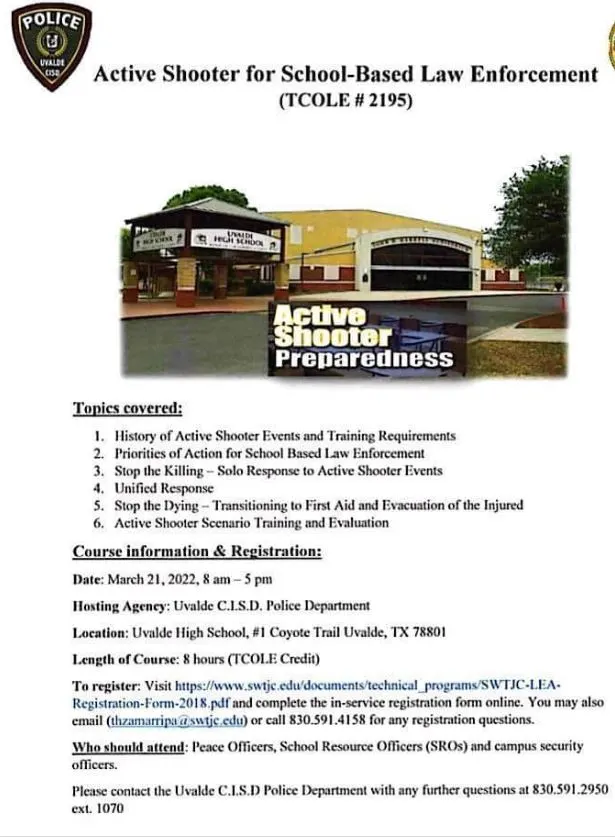 총기 난사로 19명의 어린이와 2명의 교사가 사망한 참사 발생 두달전 학교내 총격과 같은 비상상황에 대한 훈련을 진행했고 유벨디 경찰서장도 지난해 12월 훈련을 마쳤으나 이번 총격사건에서 대기 명령을 내린 것으로 밝혀졌다. 또 현장에 급파된 경찰들도 훈련 지침을 따르지 않은 것으로 알려졌다.