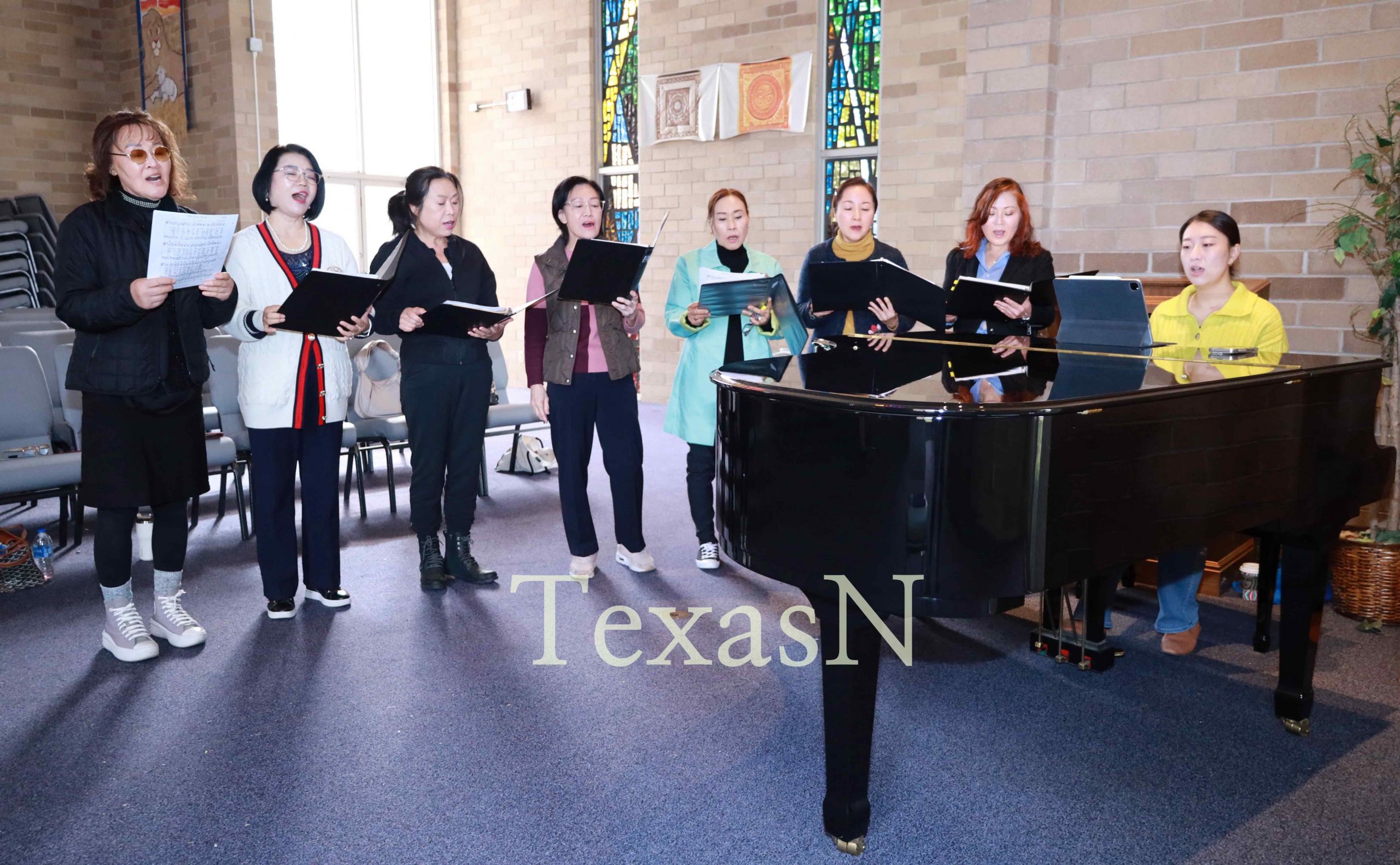 [사진=텍사스N] 오스틴 한인합창단 오스틴 코리안 하모니 단원들이 김주영 지휘자의 피아노 반주에 맞춰 연습에 매진하고 있다.