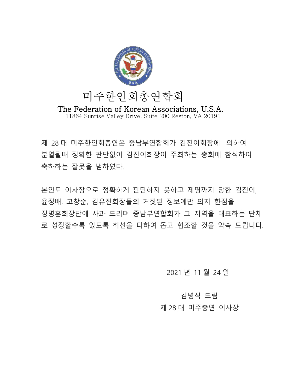 미주한인회총연합회 28대 김병직 이사장, 중남부연합회에 공개 사과