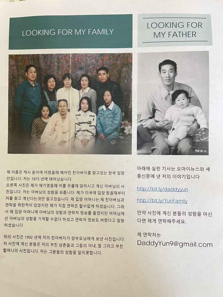 그녀가 시민권을 받은 후 가장 처음 한 일은 가족찾기였다. 생부의 이름은 알지 못하지만 아버지는 양어머니에게 가족사진을 보내왔다. 사진 뒷면에는 할머니와 큰삼촌, 작은 삼촌의 아이들이라는 친필 설명이 있었고, 아버지 증명사진 뒷면에는 ‘아빠의 최근 모습’이라고 적혀있다.