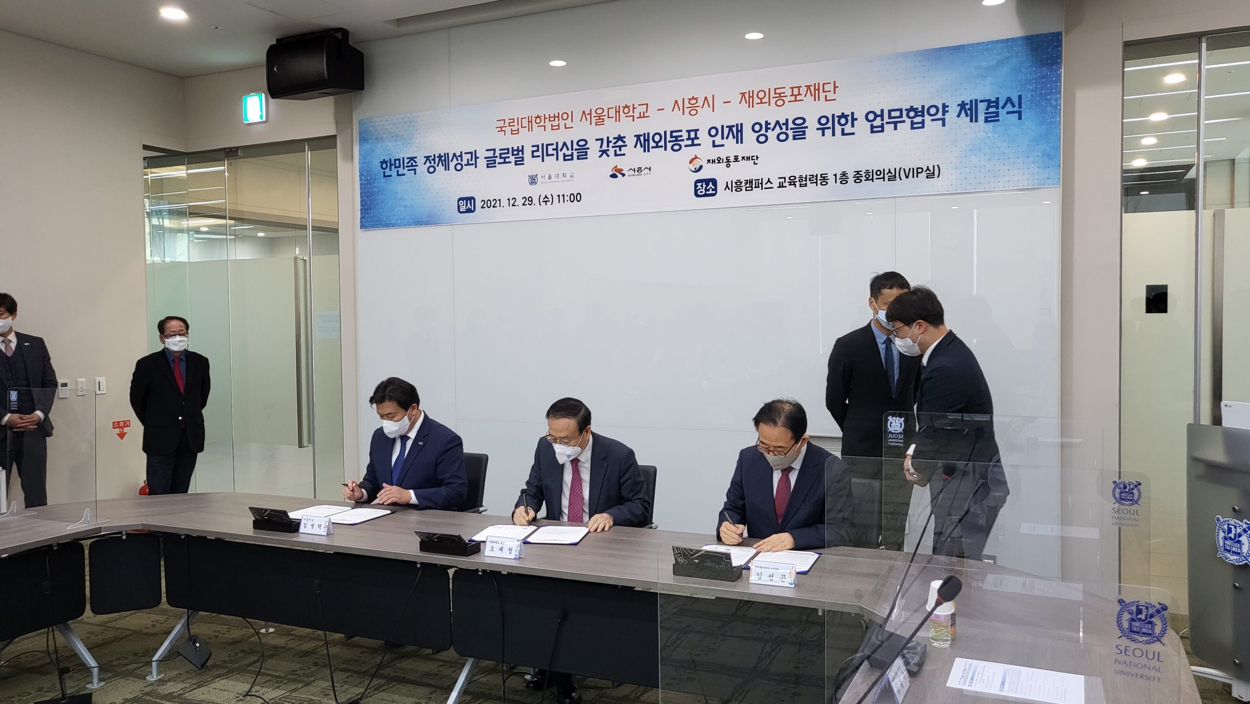 재외동포재단(이사장 김성곤)과 서울대학교(총장 오세정), 시흥시(시장 임병택)는 750만 재외동포 및 국내 체류동포를 한민족 정체성과 글로벌 리더십을 갖춘 인재로 양성하고 재외동포와 모국 간의 상생발전에 기여하고자 「재외동포교육문화센터(가칭)」를 서울대학교 시흥캠퍼스 내에 건립을 추진하기로 했다.