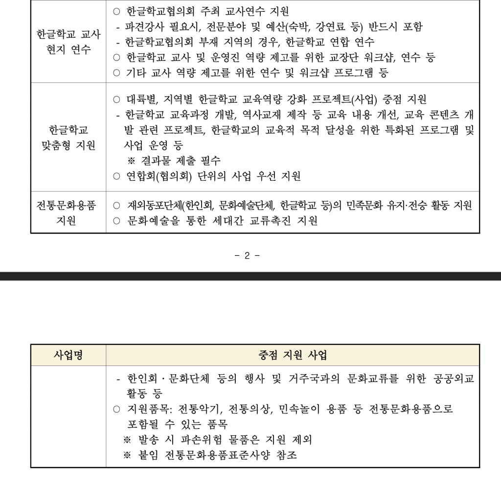 재외동포청은 또 “하나의 단체가 다수의 사업을 신청할 경우 건 별로 신청해야 하며 지원신청시 사업의 목적과 기대효과만 적시하지 말고 가장 중요한 사업내용을 구체적이고 명확하게 작성해야 한다”고 설명했다.
