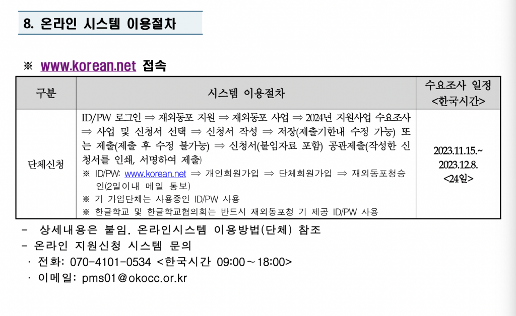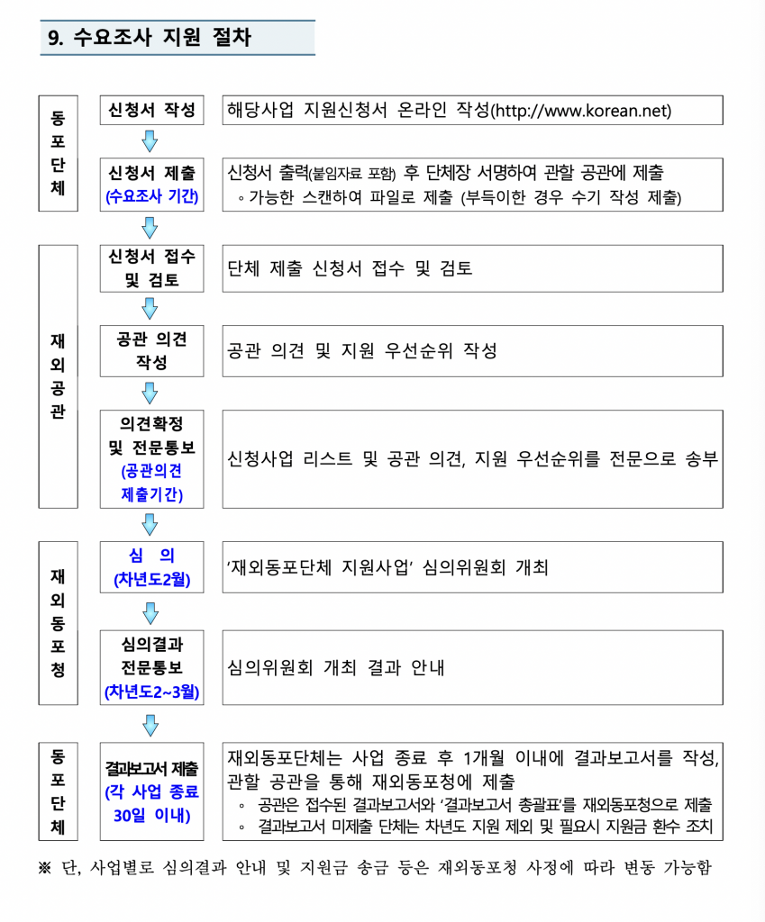 내년 1월부터 12월까지 시행되는 동포단체의 사업 및 행사 지원을 위한 수요조사로 오는 12월 8일(한국시간)까지 실시하며 온라인 지원신청 시스템 (클릭, korean.net)을 통해 신청서를 작성해 제출하면 된다.