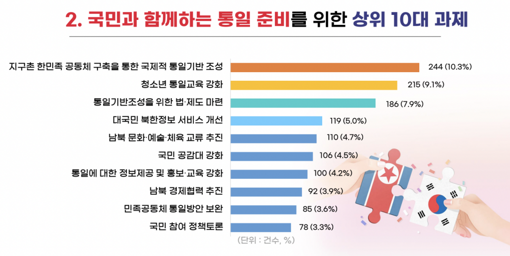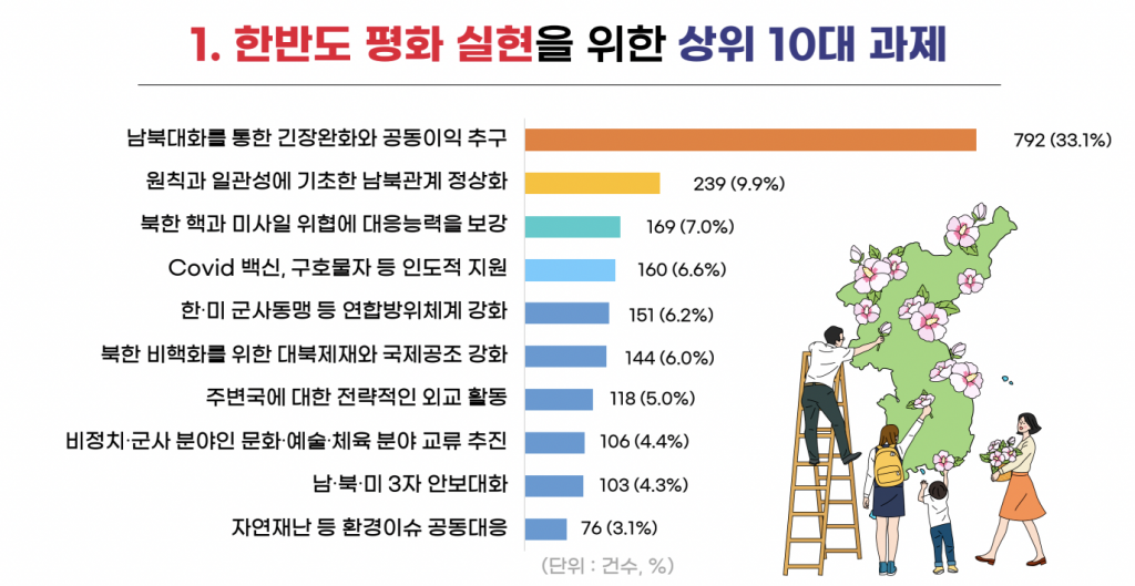 민주평통은 2022년 2분기 ‘남북관계 정상화와 평화의 한반도 건설을 위한 대내외 추진방안’이라는 대주제로 전세계 민주평통 자문위원들의 의견 수렴결과를 발표했다.