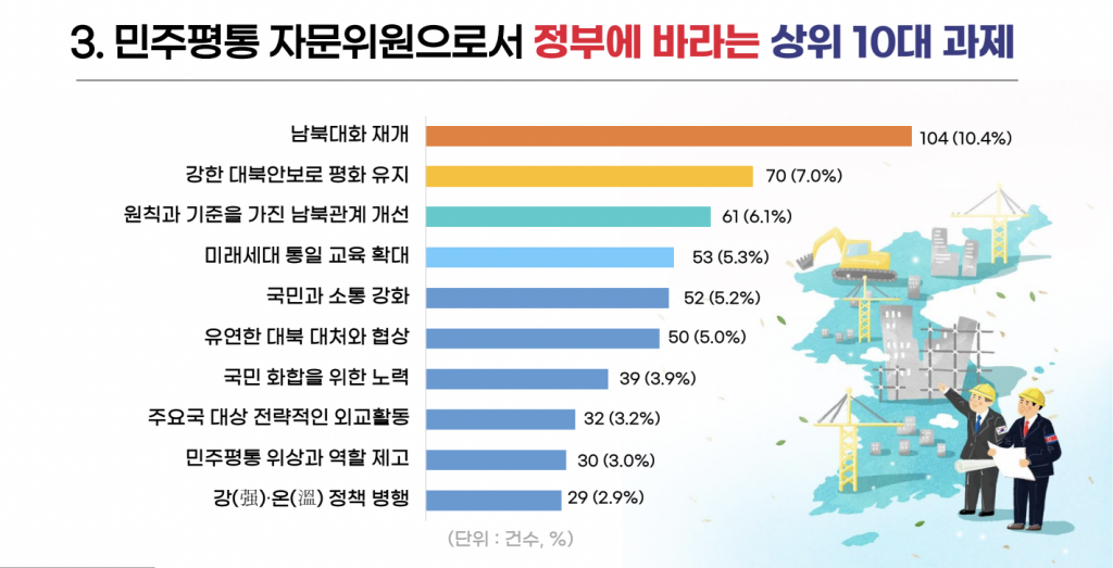 민주평통 자문위원으로서 본국 정부에 바라는 바로는 남북대화를 재개해야 한다는 의견이 10.4%로 가장 많았고 강한 대북안보로 평화를 유지해야 한다는 의견이 7%로 뒤를 이었다. 또 원칙과 기준을 세운 뒤 남북관계를 개선(6.1%)하고 미래세대의 통일교육을 확대(5.3%), 국민과 소통 강화(5.2%), 유연한 대북대처와 협상(5%) 등이 필요하다는 의견이 이어졌다.