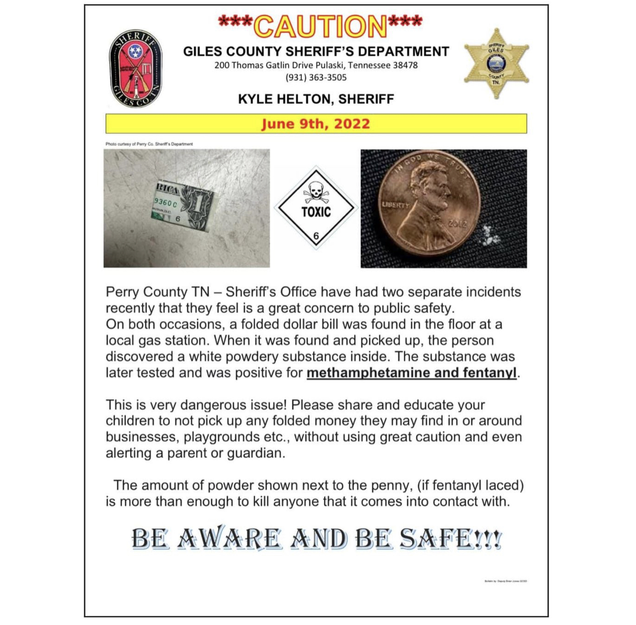 테네시주 네슈빌과 헌츠빌 사이에 위치한 자일스 카운티 보안국이 페이스북을 통해 바닥에 접힌 채 떨어진 1달러 지폐속에 펜타닐과 메스 암페타민이 발견되는 일이 잇따라 발생하고 있다고 경고하며 절대 건드리지 말라고 당부했다.