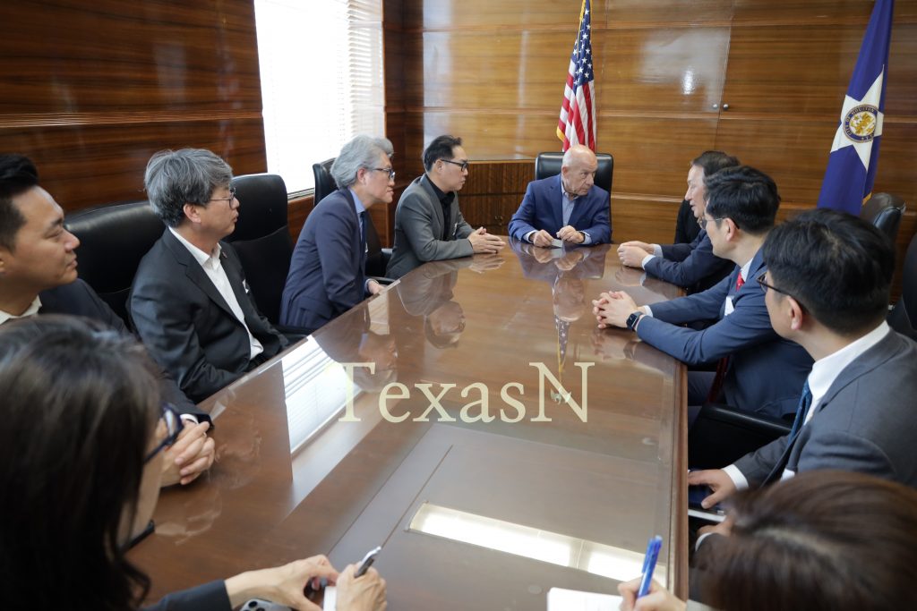 [사진=텍사스N] 제주국제자유도시개발센터 양영철 이사장(사진 왼쪽에서 5번째) 및 경제사절단과 휴스턴대학교 백기준 교수, 휴스턴 한인상공회 이든 리 회장, 강문선 이사장, 알칸사 한인상공회 이창헌 회장이 존 위트마이어 휴스턴 시장(사진 왼쪽에서 4번째)을 예방하고 제주국제도시개발센터의 주력사업을 홍보하며 협력을 당부했다.