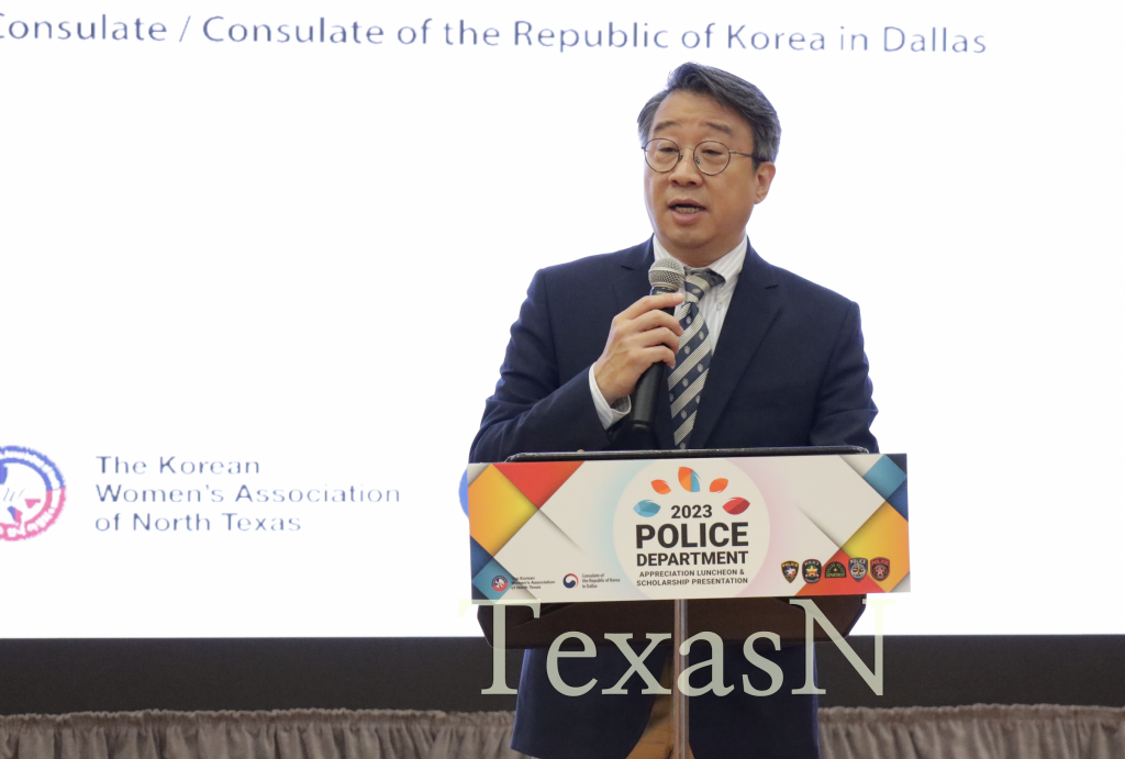 [사진=텍사스N file] 지난해 열린 북텍사스 5개 경찰국 자녀 장학금 수여식 및 오찬행사에서 김명준 출장소장이 인사말을 하고 있다.
