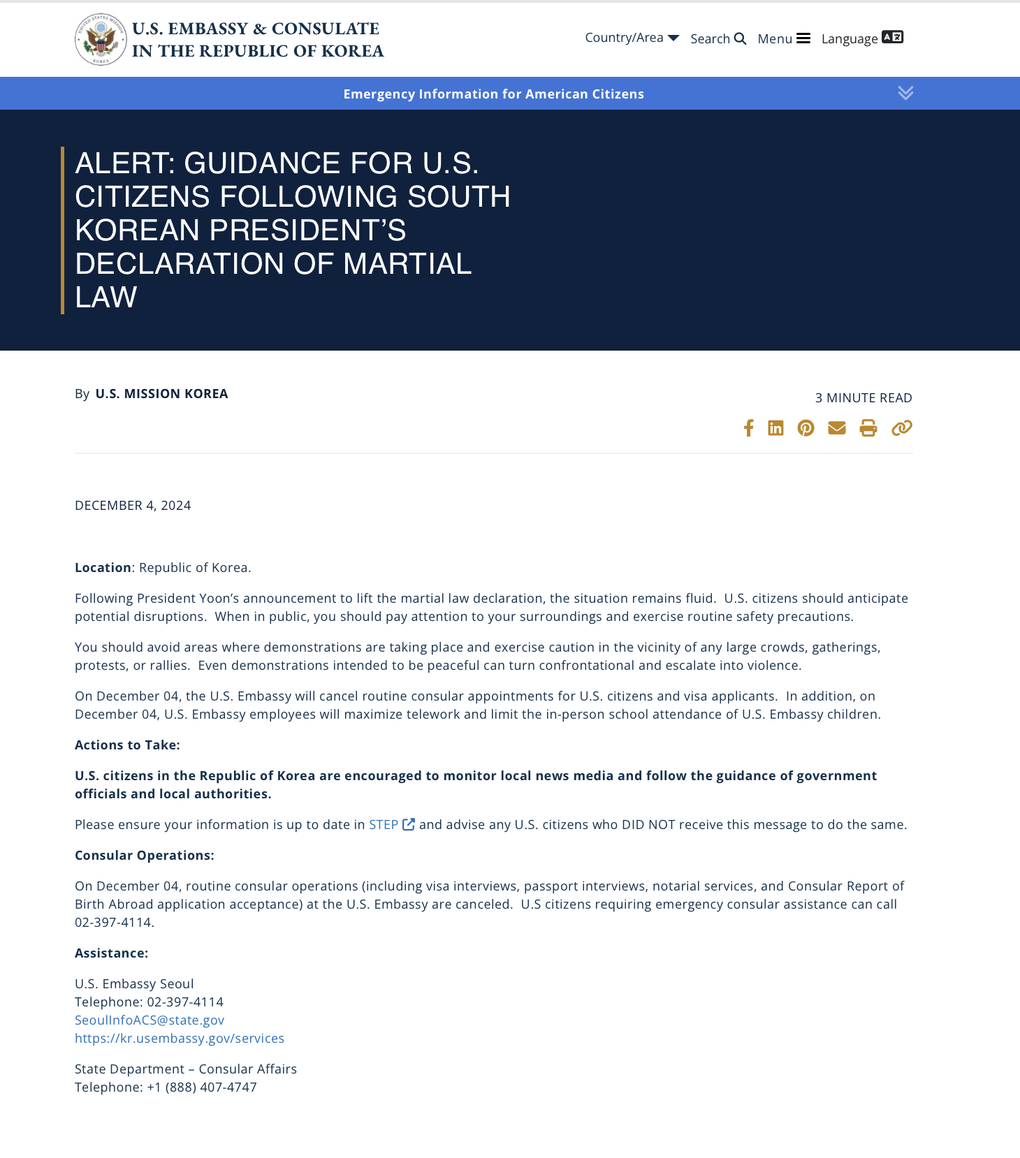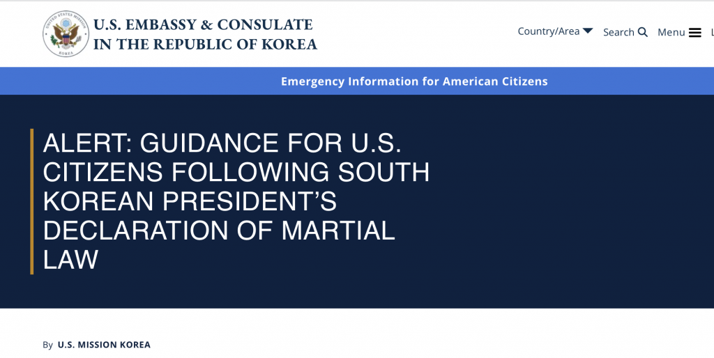 주한미국대사관이 ‘한국 대통령의 계엄령 선포에 따른 미국 시민 안내’를 통해 “윤석열 대통령의 계엄령 해제 발표 이후에도 상황은 유동적이다. 미국 시민들은 잠재적인 혼란을 예상해야 한다. 공공장소에서는 주변 상황에 주의를 기울이며 일상적인 안전 예방 조치를 취하시기 바란다”고 안내했다.