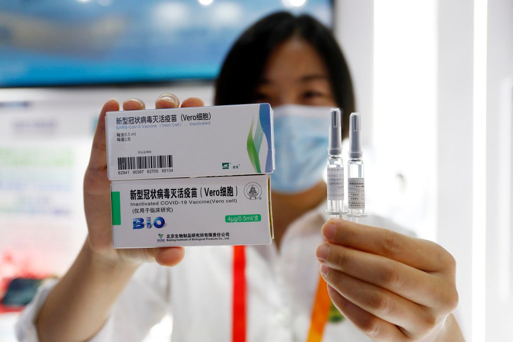 BEIJING, CHINA - SEPTEMBER 05: An exhibitor shows inactivated COVID-19 vaccine candidate from China National Biotec Group (CNBG) of Sinopharm Group during the 2020 China International Fair for Trade in Services (CIFTIS) at the Beijing Olympic Park on September 5, 2020 in Beijing, China. (Photo by Han Haidan/China News Service via Getty Images)