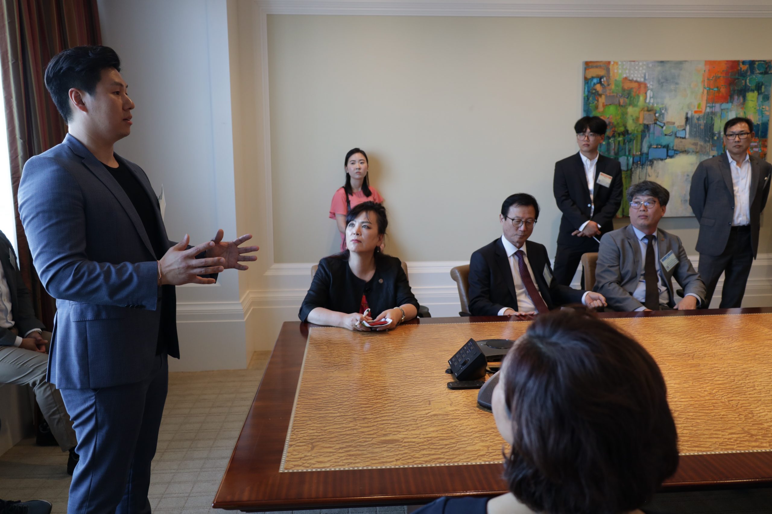 사진/ 휴스턴 한인상공회 스티브 윤 부회장이 미주한인상공회의소 산하 지역 챕터 회장들에게 자신의 경험담을 나누며 차세대 한상으로서의 비전에 대해 설명했다.