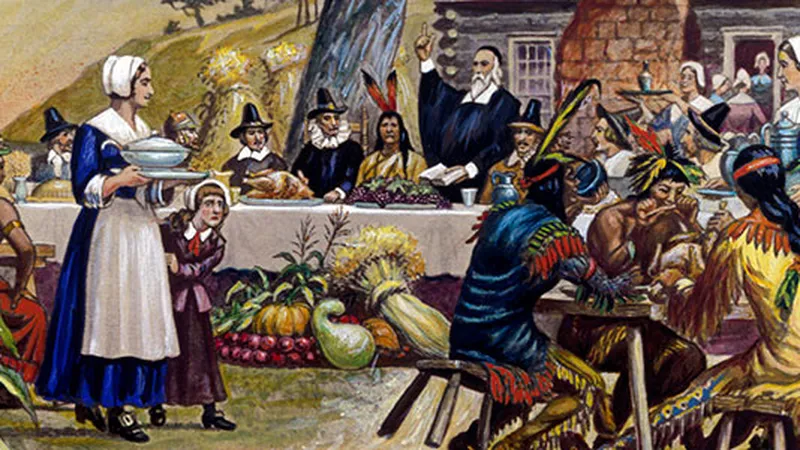 사진/ 스밋소니언 매거진 (Traditional Thanksgiving dinner includes turkey, stuffing and mashed potatoes but the First Thanksgiving likely included wildfowl, corn, porridge and venison. Bettmann / Corbis)