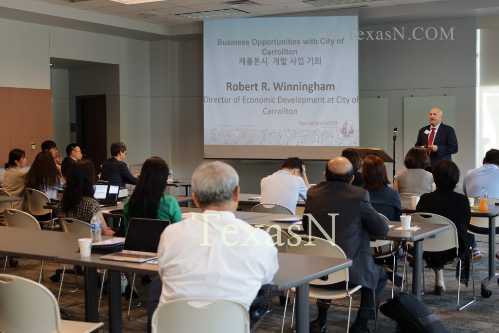 [사진=텍사스N] 21일(목) 달라스 한인상공회의소가 주최한 캐롤튼 개발사업 세미나에서 로버트 위닝햄 캐롤튼시 경제개발국장이 지역경제활성화를 위한 캐롤튼 시의 경제개발상황 및 인센티브에 대해 설명하고 있다.