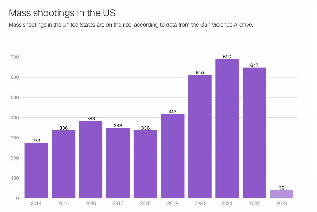 미국은 올해 들어서만 총 39건의 총기난사 사건이 발생했다. CNN은 총기로 인한 공포의 장면이 미국에서 점점 더 친숙해지고 이는 상황이라며 총기문제를 지적했다.
