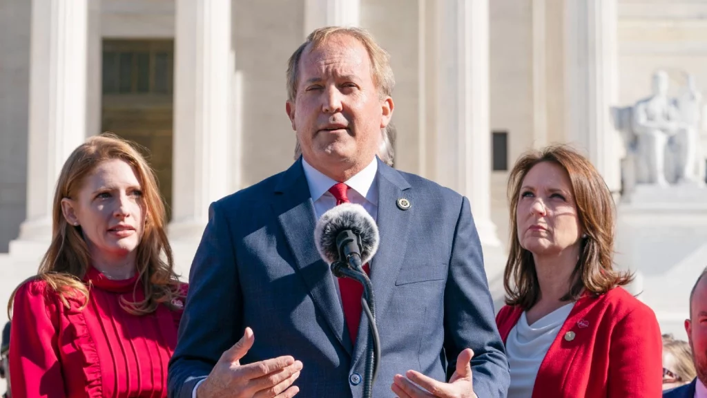 사진/ NBC(Texas State Rep. Shelby Slawson, left, and Texas State Sen. Angela Paxton, right, listen as Texas Attorney General Ken Paxton, center, speaks to anti-abortion activists at a rally outside the Supreme Court, Monday, Nov. 1, 2021, on Capitol Hill in Washington)