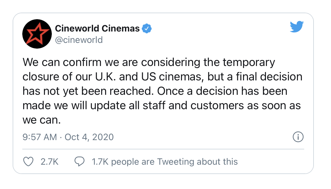 시네월드는 결국 영업중단 카드를 들었고 이 때문에 리갈 극장 직원 대부분이 직장을 잃게 됐다. 영국의 127개 극장에 대해서도 한시적 영업중단을 결정, 미국과 영국을 합해 총 4만 5,000여명의 직원들이 임금을 받지 못하게 됐다.