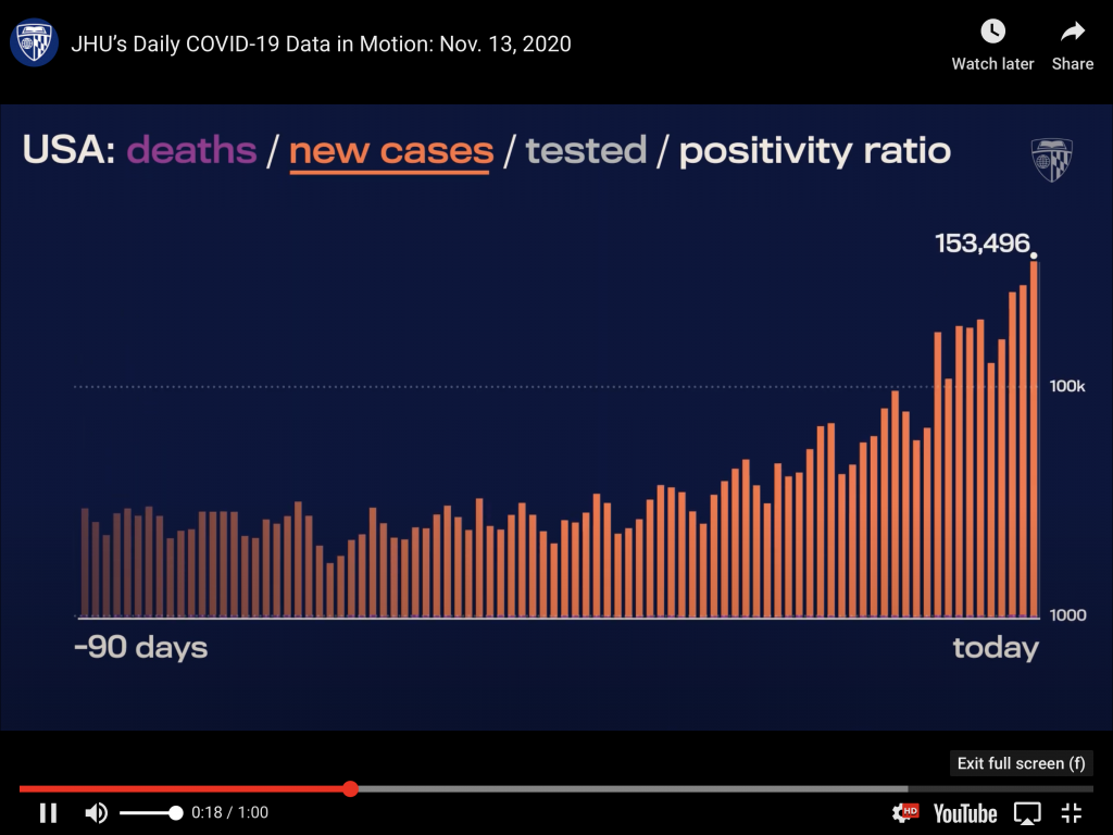 13일(금) 미 전역에서 코로나19 신규확진자가 18만 4,000명이 추가됐다. 존스홉킨스 대학의 코로나 현황에 따르면 12일(목) 하루 신규확진자가 15만 3,496명는데 하루만에 18만 4,000의 신규확진자 발생한 것이다. 이에 따라 전미 누적확진자의 수는 천만명을 훌쩍 넘어섰고 24만 4,000명이 사망했다.