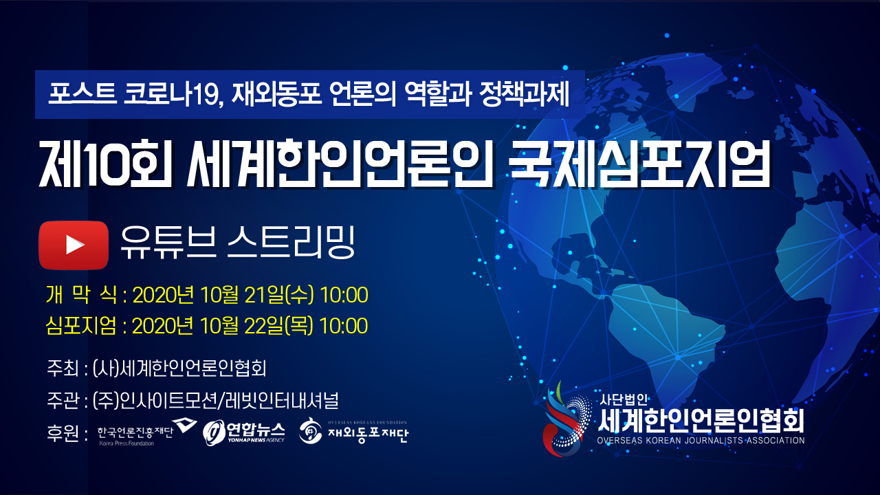 전 세계 재외동포 한인언론인들의 네트워크인 세계한인언론인협회(회장 전용창)가 한자리에 모인다. 오는 10월 21일부터 24일까지 3박 4일동안 ‘제19회 세계한인언론인대회’와 ‘제10회 세계한인언론인 국제심포지엄’을 온라인과 오프라인을 이용, 하이브리드 방식으로 진행한다.