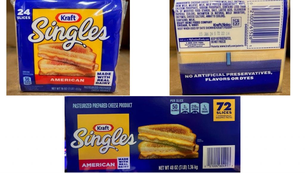 또 3파운드 멀티팩 Kraft Singles American Pasteurized Readyd Cheese 제품(상자 UPC 0 2100060491 3, “최적 사용 기한” 2024년 1월 9일부터 2024년 1월 13일, 2024년 1월 16일)도 리콜 대상이다.