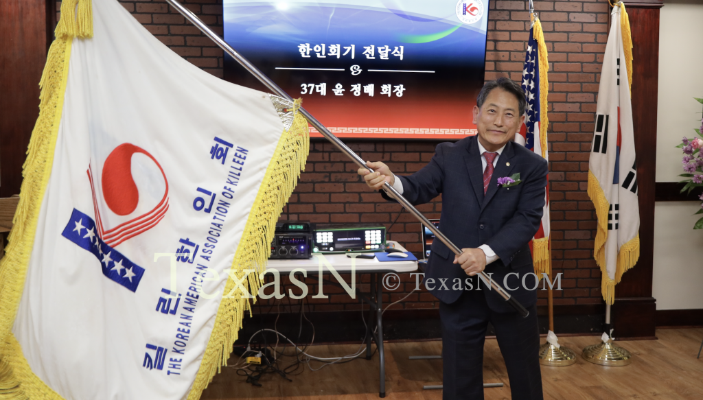 [사진=텍사스N] 킬린한인회 38대 정필원 회장이 윤정배 회장으로부터 전달받은 한인회기를 들어보이며 신임회장단의 출발을 알렸다.
