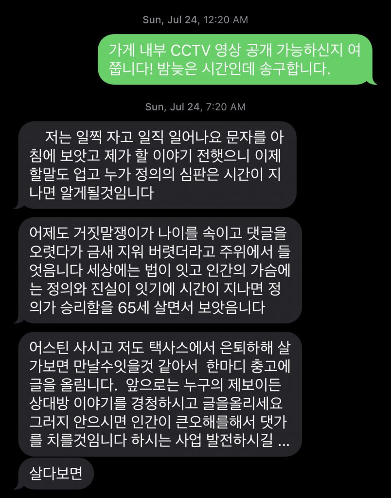 다음은 한인업주가 본지에 제공한 본인의 피해증거 사진과 내부 영상공개 요청에 대한 답변이다.