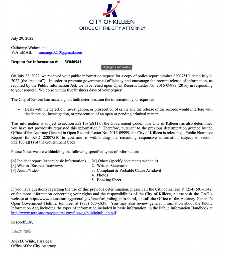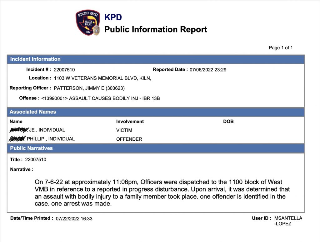본지는 킬린의 일식당 한인여직원 폭행사건을 단독 보도하기 앞서 킬린 경찰국에 공식자료를 요청했고 7월 31일(일) 해당 리포트를 제공받았다. 경찰리포트에는 폭행신고 접수 후 현장 출동한 시간과 폭행현장에서 폭행 당사자를 체포했다고 적혀 있다.