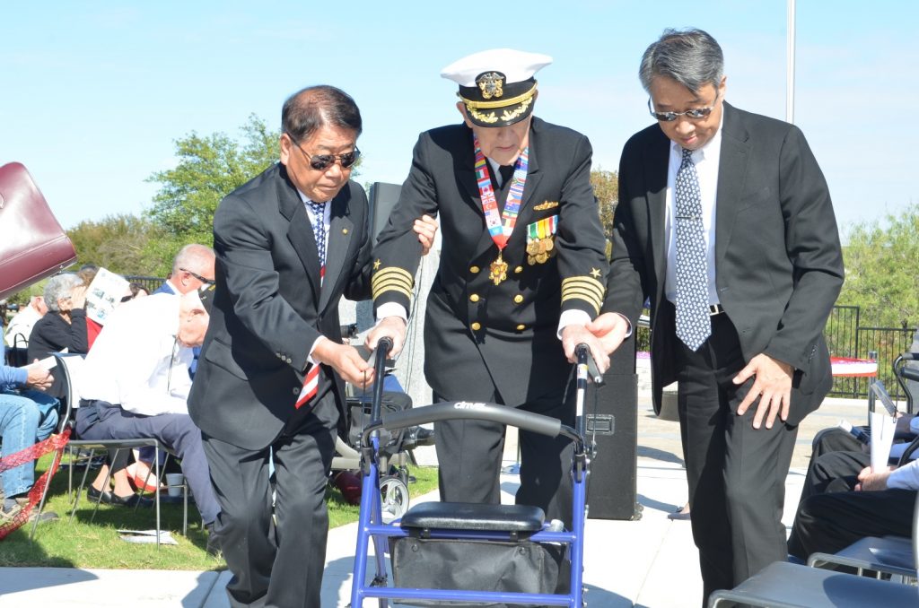 사진/ 해군 참전용사를 부축하며 이동을 돕고 있는 민주평통 달라스협의회 오원성 회장(사진왼쪽)과 달라스출장소 김명준 소장(사진 오른쪽)