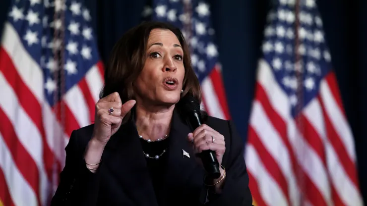 사진/ CNBC (US Vice President Kamala Harris speaks at a moderated conversation with former Trump administration national security official Olivia Troye and former Republican voter Amanda Stratton on July 17, 2024 in Kalamazoo, Michigan. Chris Dumond | Getty Images News | Getty Images)